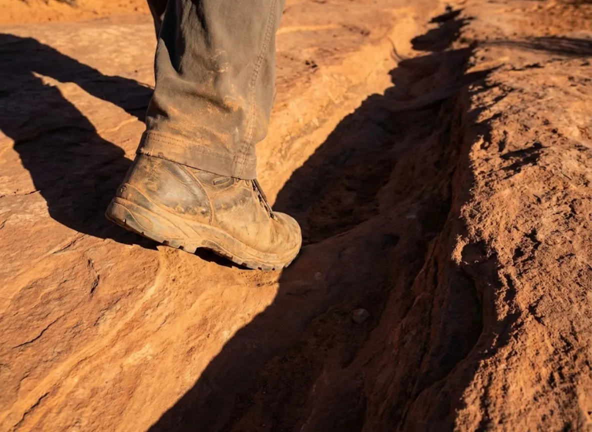 Close-up of dusty hiking boots stepping into a deep historical wagon rut carved into sandstone rock.